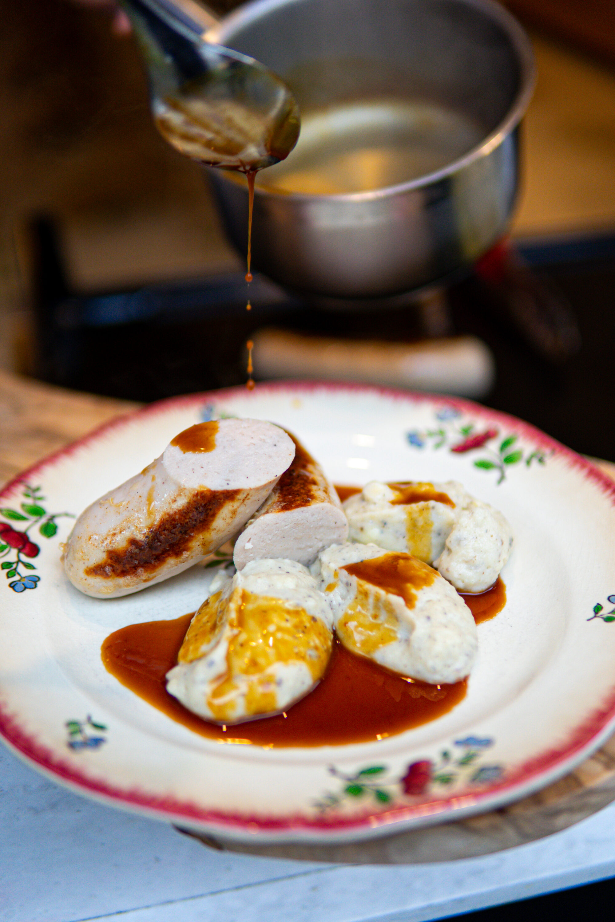 À l’arrière, une plancha chauffe dans un calme concentré. Les saucisses maison y défilent une à une, certaines végétales, d’autres totalement imprévisibles, toutes fières de leur sort. Douze places autour de la table d’hôtes. Un petit cercle. Une mini république gourmande. Une société secrète de bons vivants.