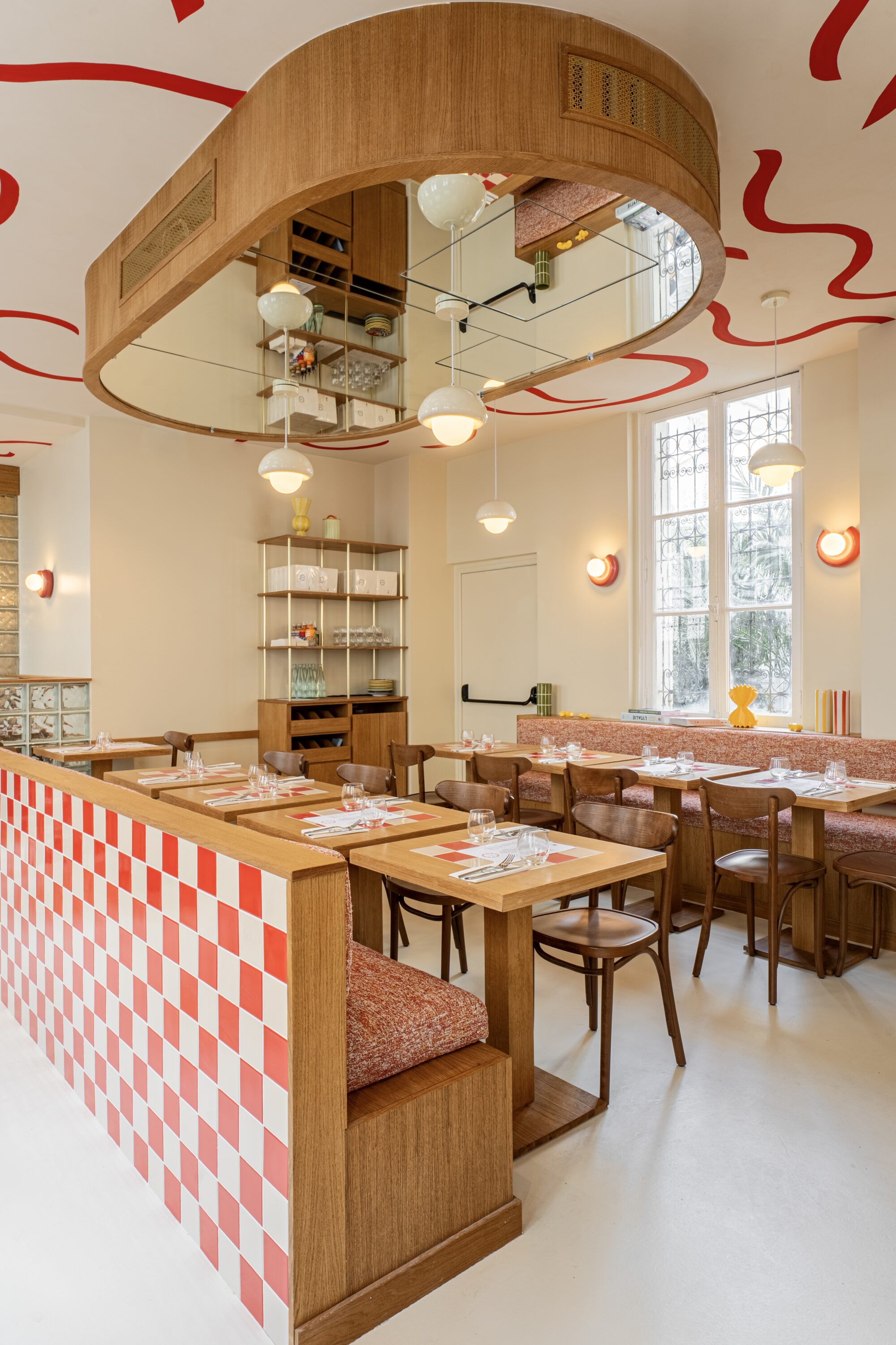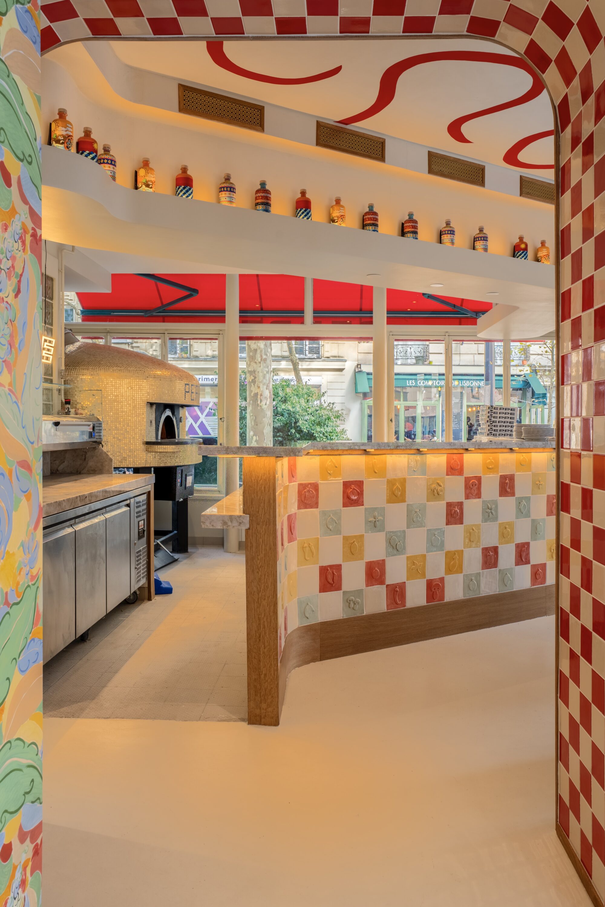 Dans cette adresse, tout semble avoir été pensé pour désorienter doucement le Parisien : les couleurs rouges corail inspirées des façades napolitaines signées par Audell Architecture, les céramiques qui donnent l’impression qu’on pourrait croiser una nonna en tablier au coin du bar, et un four à pizza qui semble surveiller la salle comme un dieu antique — un dieu chaud, rond, et pointilleux sur la cuisson.