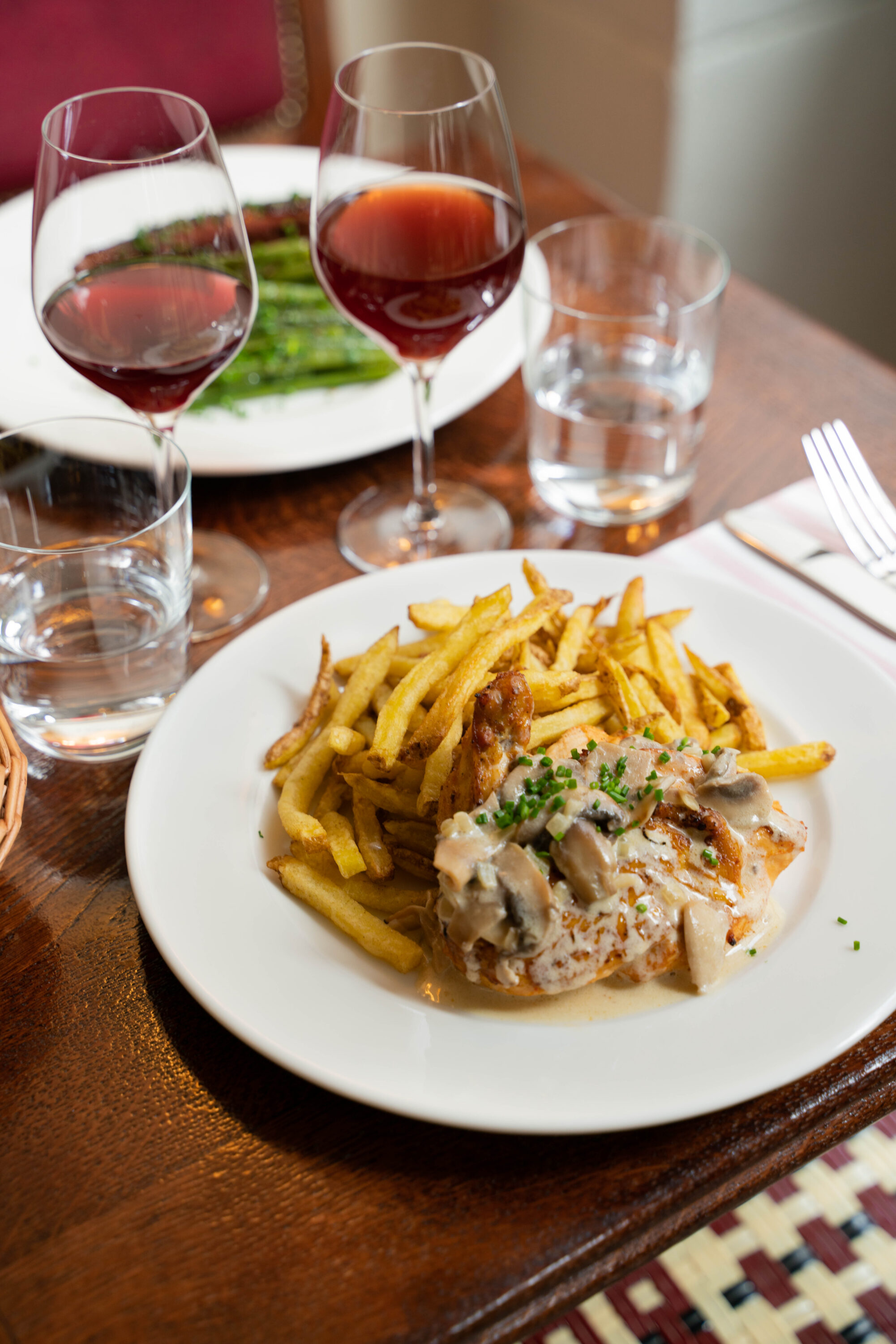 Le suprême de poulet jaune, sauce forestière, a suivi — tendre, boisé, presque scout dans son sérieux. Neven, lui, a plongé dans un magret de canard de la ferme Pountoun, nappé d’une sauce au vinaigre de framboise, accompagné d’un gratin dauphinois large, épais, crémeux, dont la seule description devrait être classée en littérature gourmande.