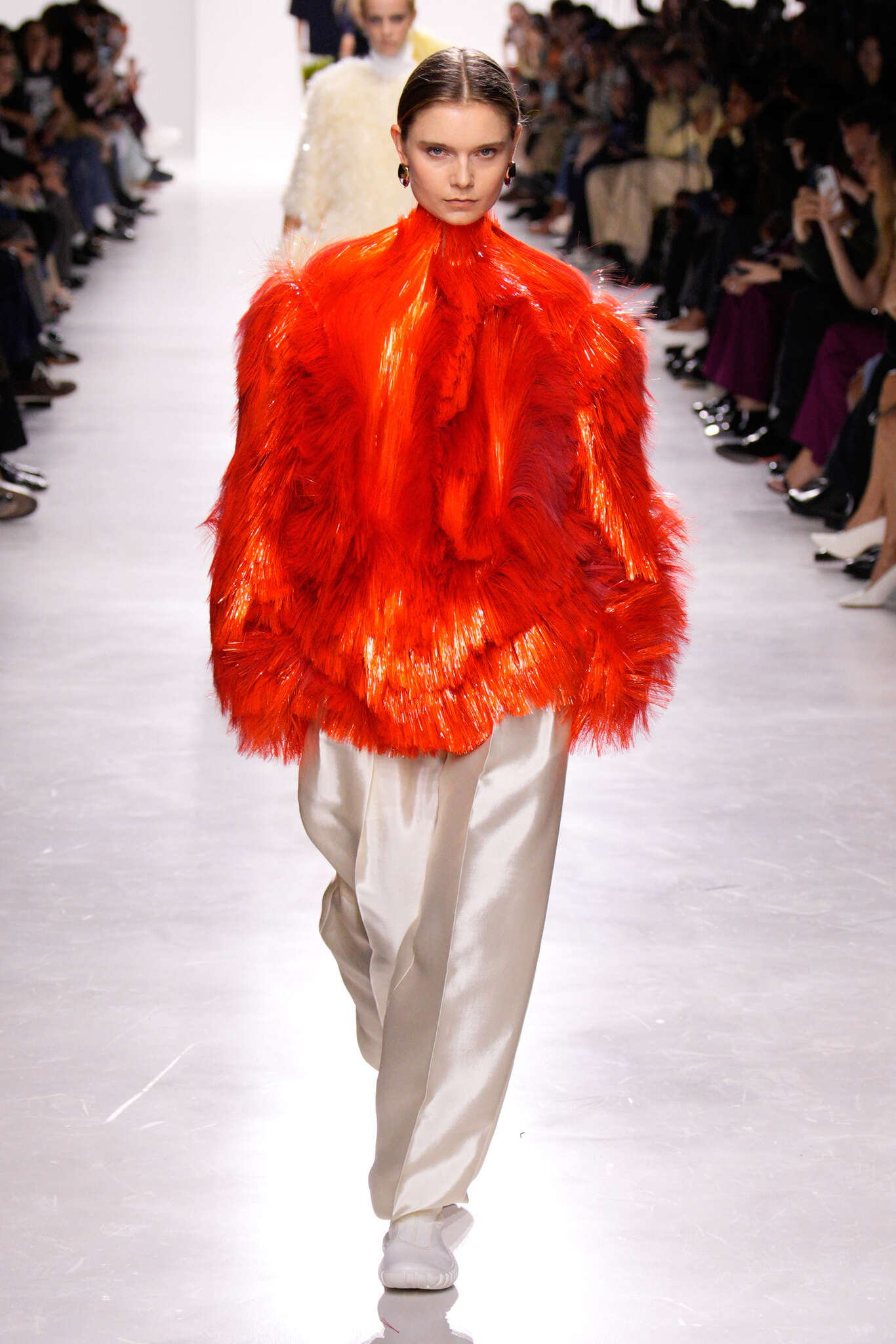 C’est cinématographique, avec des manteaux aux épaules dignes d’un roman gothique et des robes en verre recyclé qui frémissent comme des champs de blé. Bref, de la haute couture déguisée en artisanat. Et une entrée fracassante pour la créatrice britannique, qui prouve qu’elle peut transformer une maison discrète en machine à créer des moments de grâce.