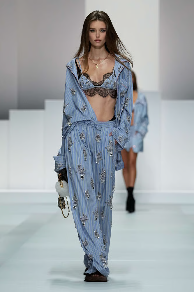 Sur la bande-son de Patty Pravo, Domenico et Stefano ont lâché leurs mannequins en pyjamas de satin couverts de strass, en soutiens-gorge scintillants et en lingerie noire façon veuves siciliennes prêtes pour un rendez-vous galant douteux. Une ambiance « boudoir avec talons aiguilles », où la séduction s’affiche sans filtre. Plus cabaret que confessionnal — et pile dans l’air du temps.