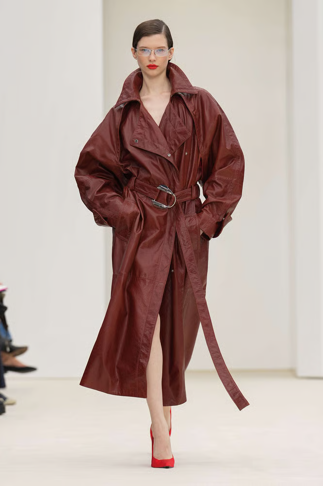 Louise Trotter n’est pas venue jouer petit bras pour sa première chez Bottega Veneta. Elle a pris le mot « bottega » au pied de la lettre : des trenchs ultralégers, des capes souples, des manteaux monumentaux, et partout cet intreccio — le cuir tressé maison — décliné à l’infini, jusqu’à l’invitation transformée en sac bourse.